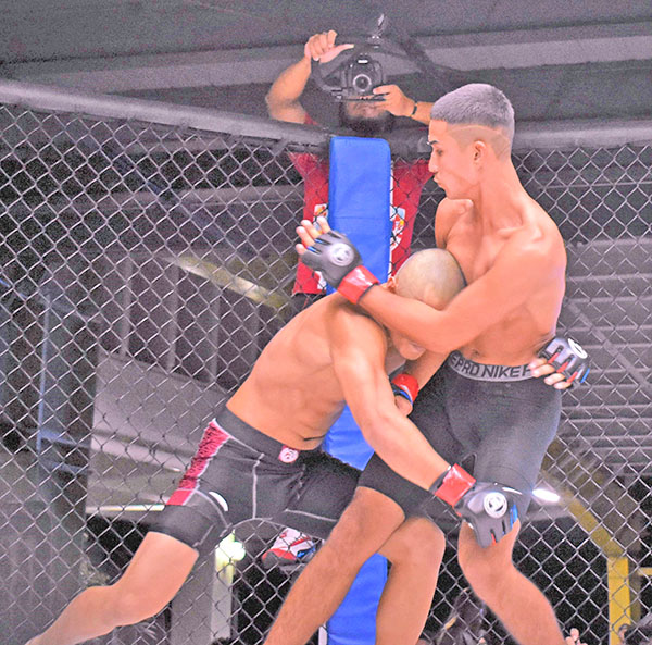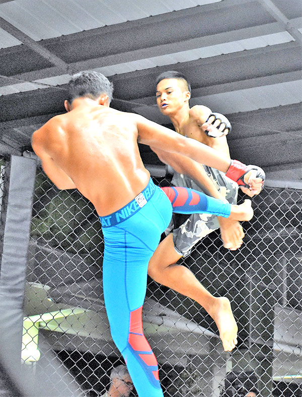 Andres “The Tanapag Beach Bad Boy” Camacho, right, jumps to block a high kick from Tinian’s Austin John King in one of the undercard bouts in the Rites of Passage 23: Beatdown held last April 27 at the Marianas Business Plaza.