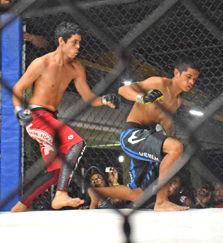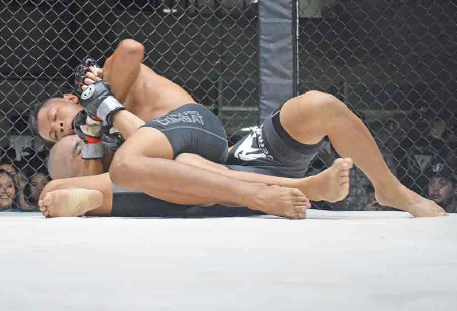 Team Tinian’s Perry Mundo, top, chokes hold Luta Top Team’s L.D. Ogo in one of the undercard fights in last Friday’s Rites of Passage 22: Rampage held at the Marianas Business Plaza in Susupe.