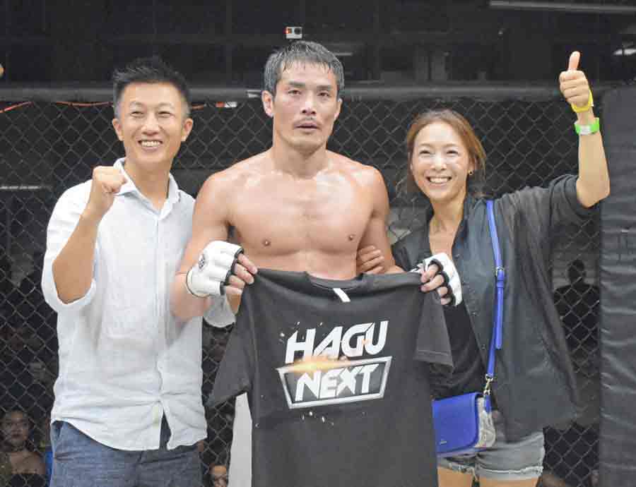 Team Ace MMA Sang Hyun Park of South Korea, center, is joined by some of his compatriots on the octagon cage after his fight against Rota’s Juan “Hot Pocket” Lizama of Steel Athletics Guam.