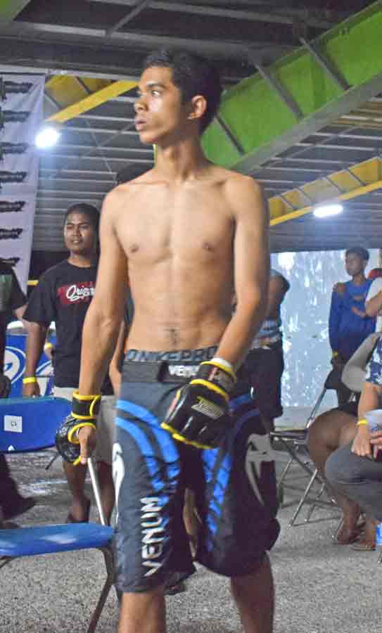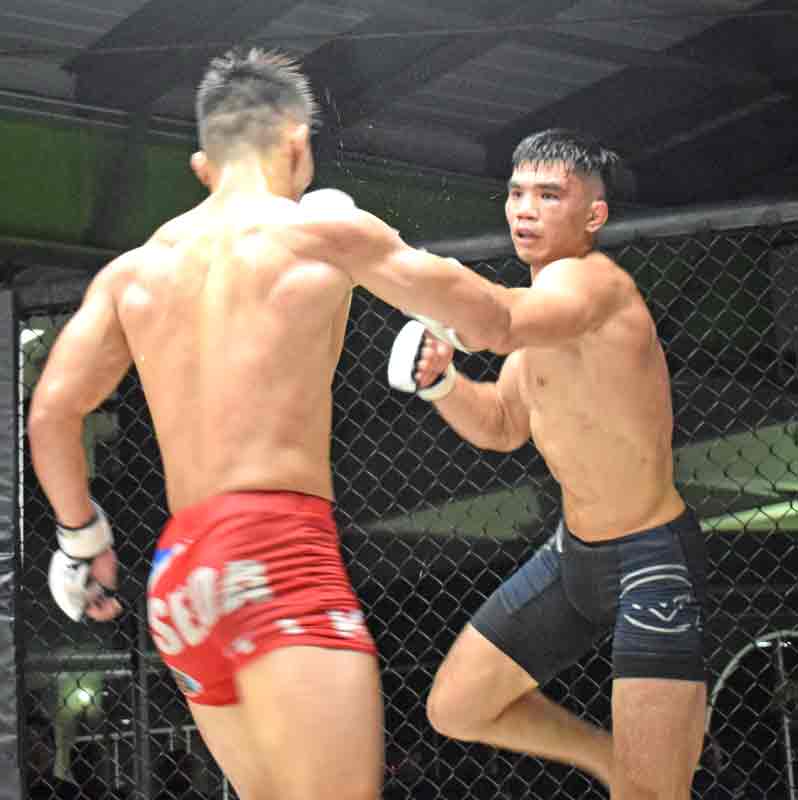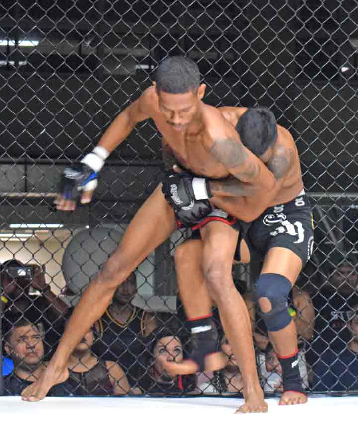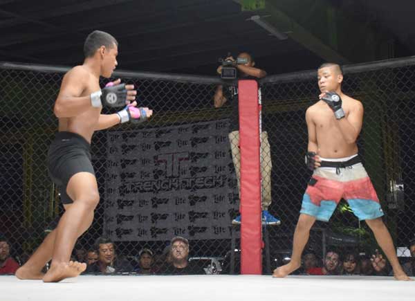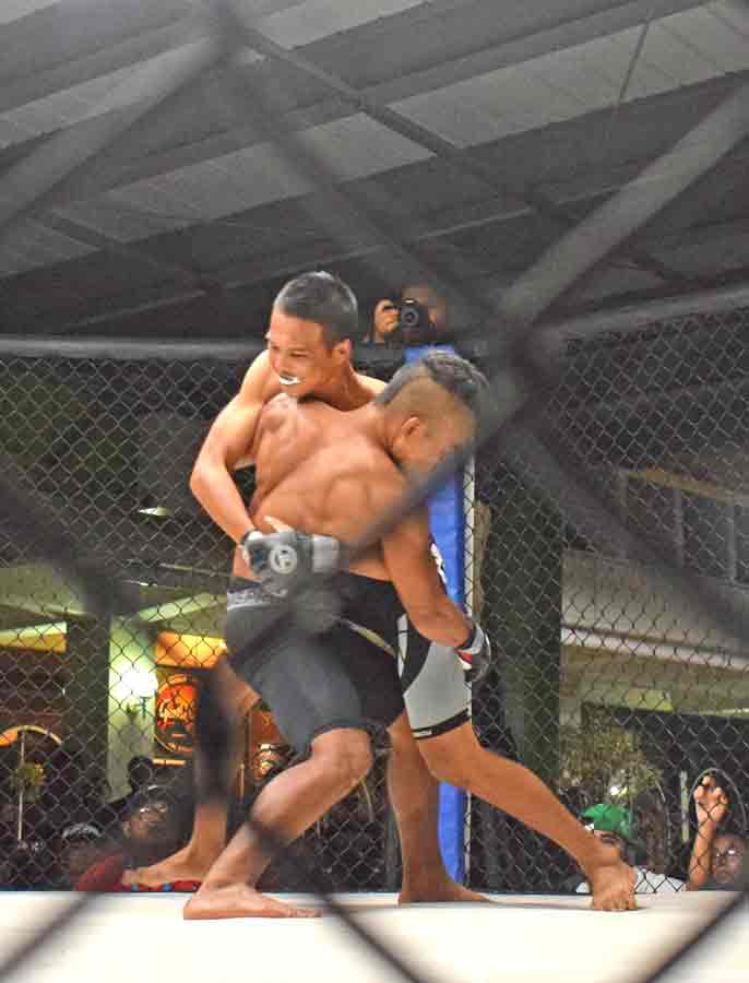Trench Tech’s Jordan “The Machine” Manglona, left, tries to prevent McKlane Alfred of Vida MMA Guam from taking him down in their flyweight title match.