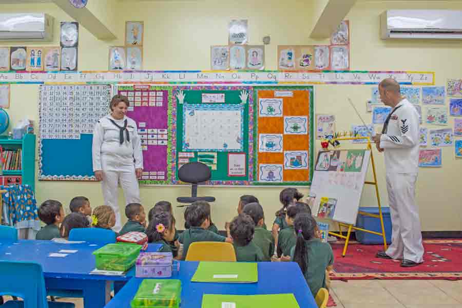 The sailors made their way around to each elementary and middle school class with enough time to spare, so they also popped in to a Child Development Center pre-Kindergarten class and play with them for a little bit.