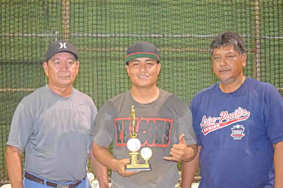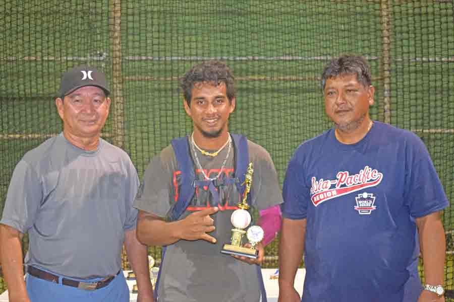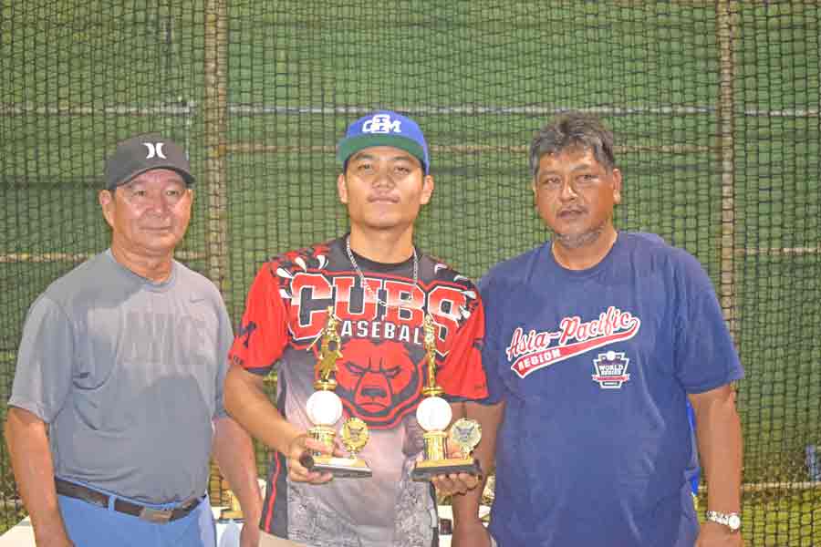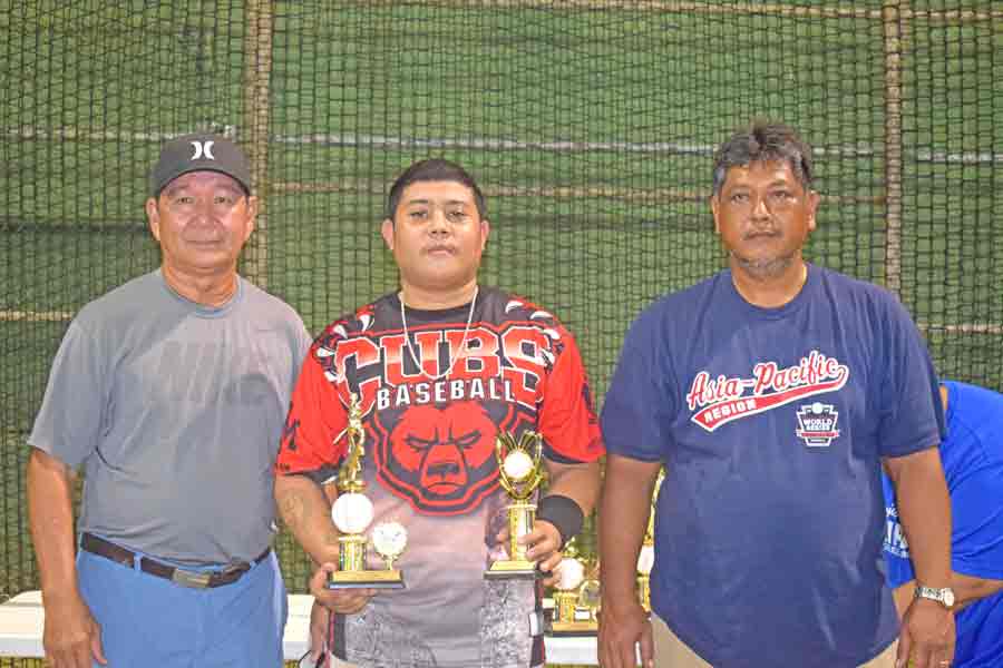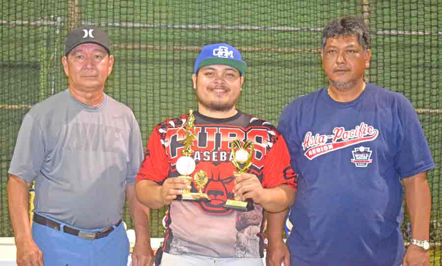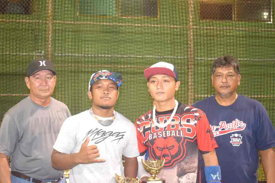 Tanapag Falcons manager Doru Camacho, right, and coach Mike Cruz, left, join members of the team for a group photo after receiving their runners-up trophy following an 8-9 loss to the GSM Cubs in the finals of the 2017 Saipan Baseball League’s Under 25 division last Friday night at the Francisco M. Palacios Ballfield.