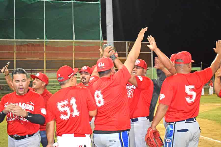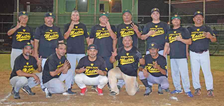 GSM players celebrate at home plate after beating the pennant champions Boleros in the Saipan Baseball League Masters division finals, 22-16, last Monday night at the Francisco M. Palacios Ballfield.