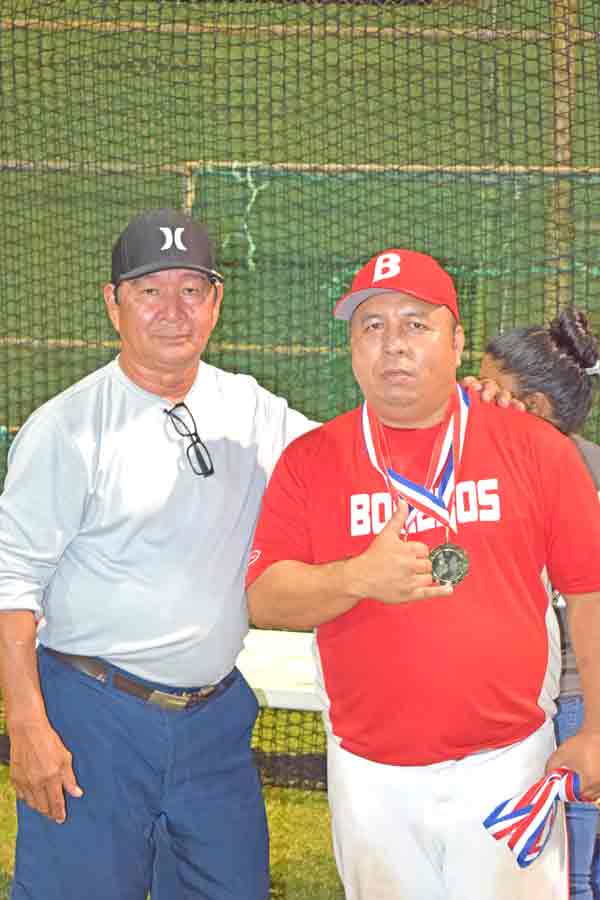 The Boleros’ Derron Flores, right, gets the Manager of the Year award for guiding his team to a 12-game sweep. SBL board member Ben Jones, left, handed Flores the award.