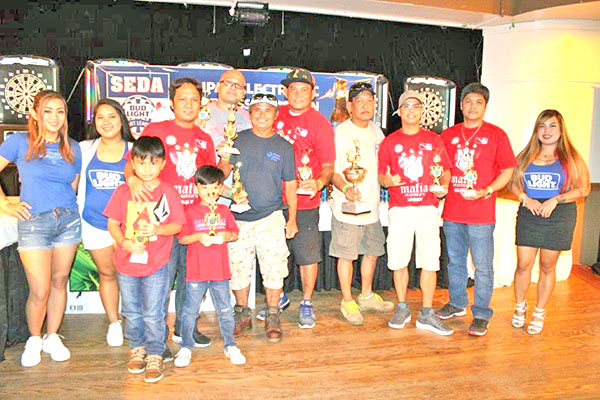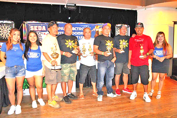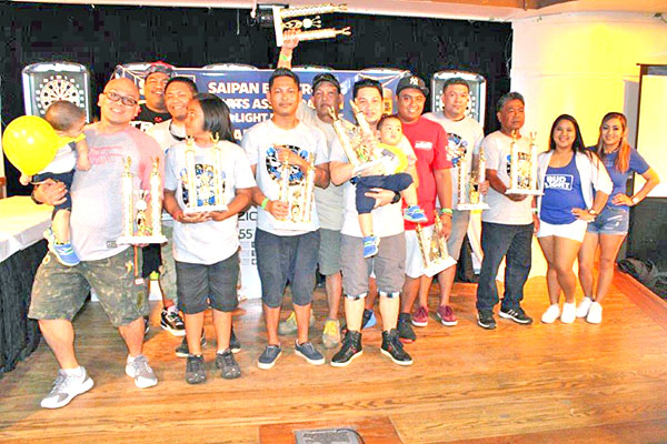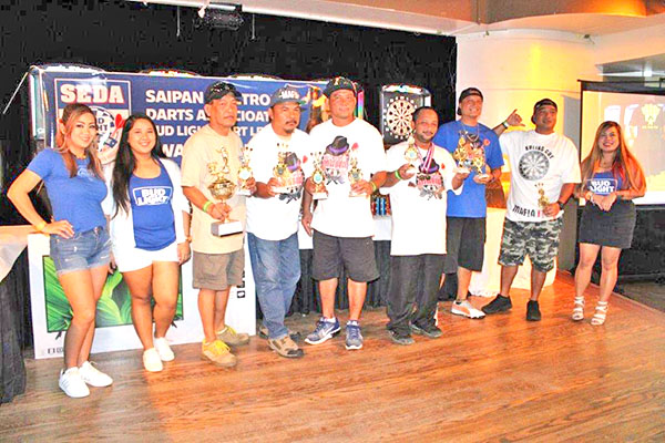 Naked Fish Na’Gupu players pose with their Bud Light Cup first place trophies in the Flame Tree Division during the awards ceremony for the 2018 Saipan Electronic Darts Association Bud Light League last Sunday at Charley’s Cabaret in Pacific Islands Club Saipan. Joining them in the photo are the awards presenters.