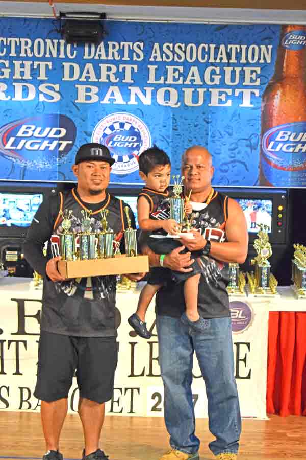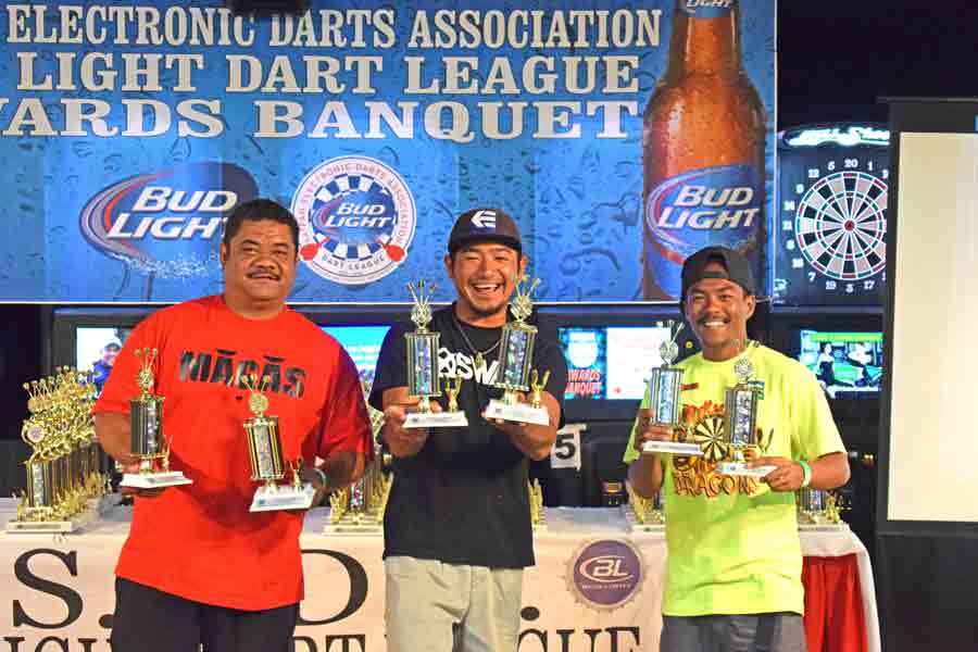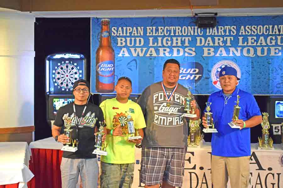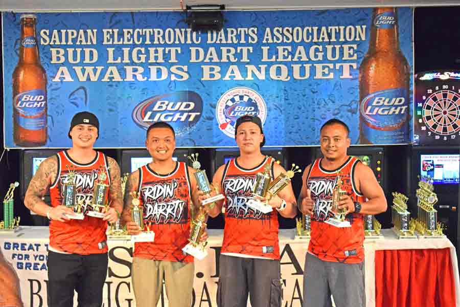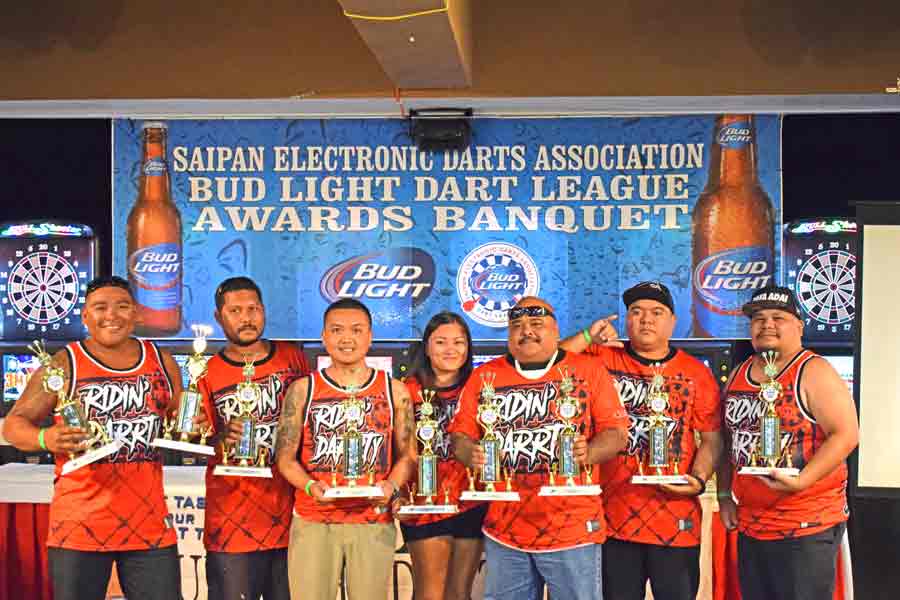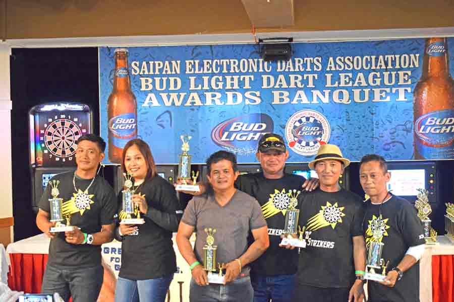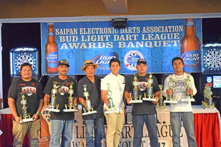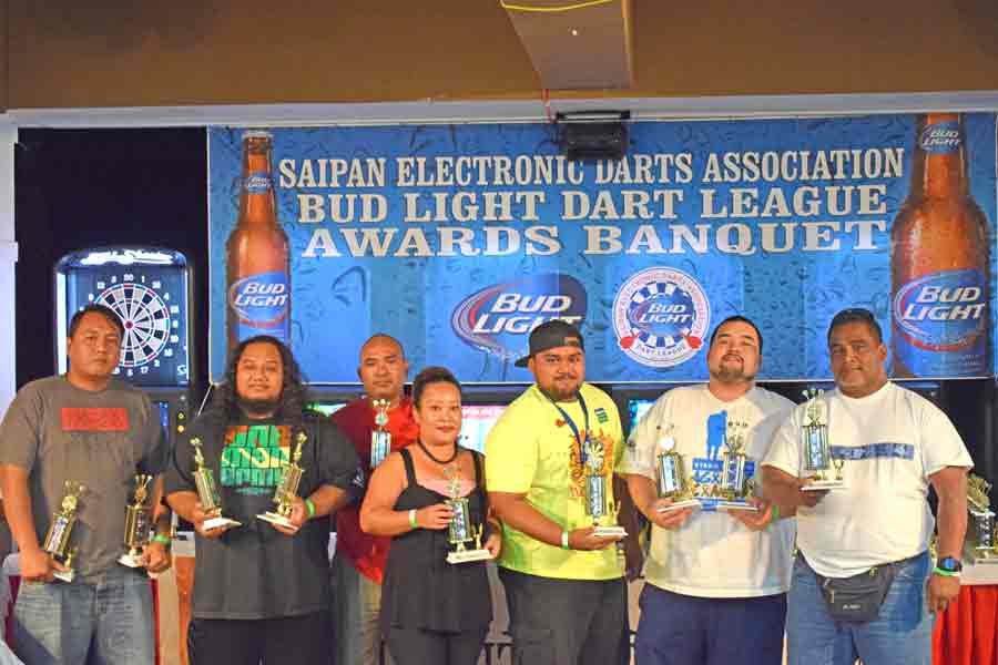 The Oleai Re-Darts members receive their individual runner-up trophies in last Sunday’s awards banquet for the Saipan Electronic Darts Association Winter/Spring Season at the Pacific Islands Club’s Charley’s Cabaret.
