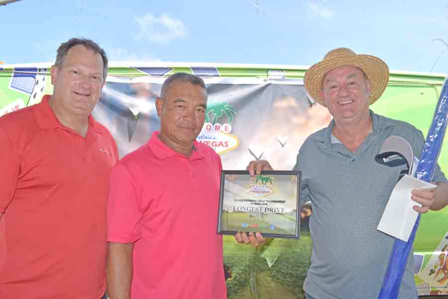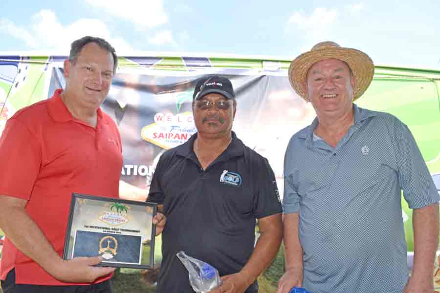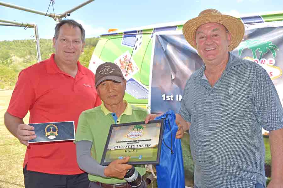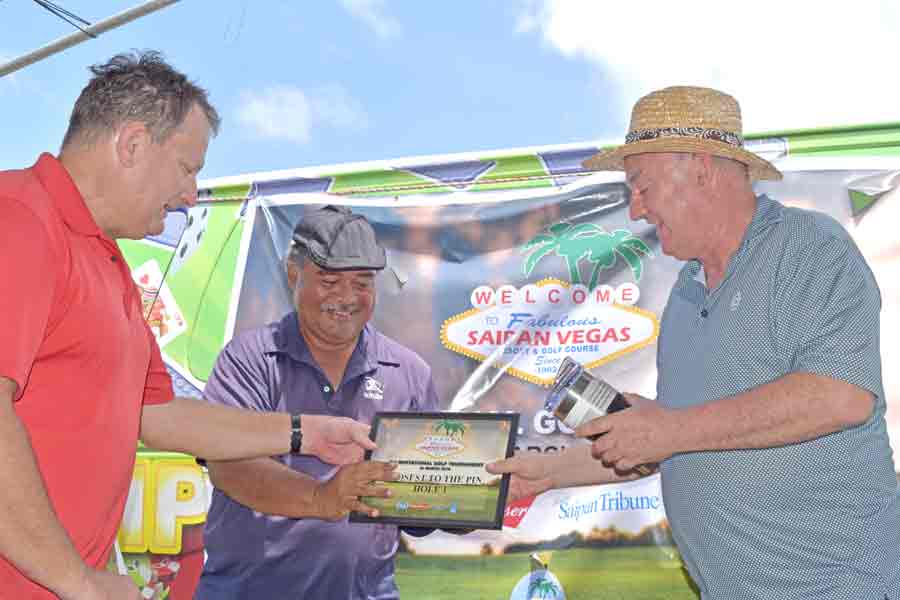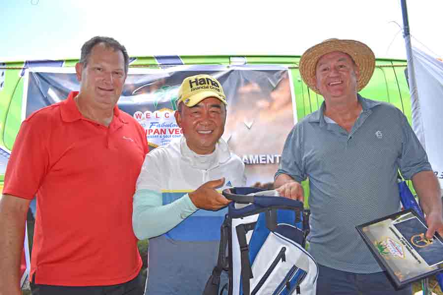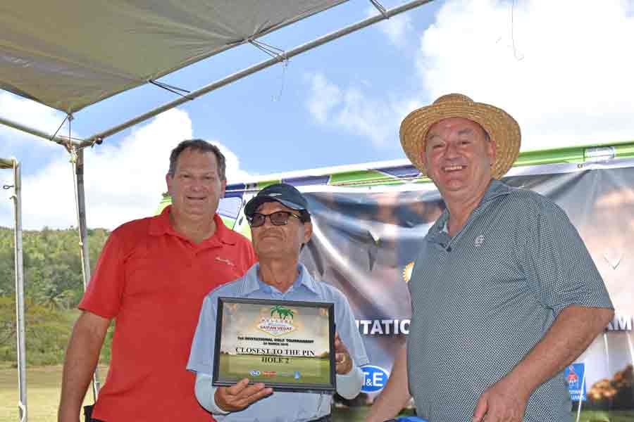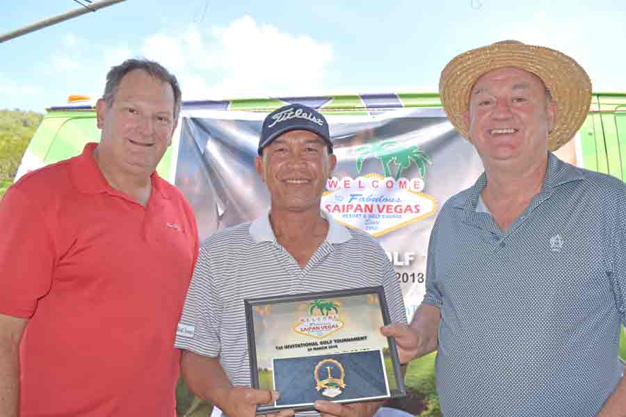 Bong Kil Kim, center, joins Saipan Vegas GM Gus Noble, right, and event planner David Largent for a group photo after getting his prizes in the closest to the pin contest at No. 6.