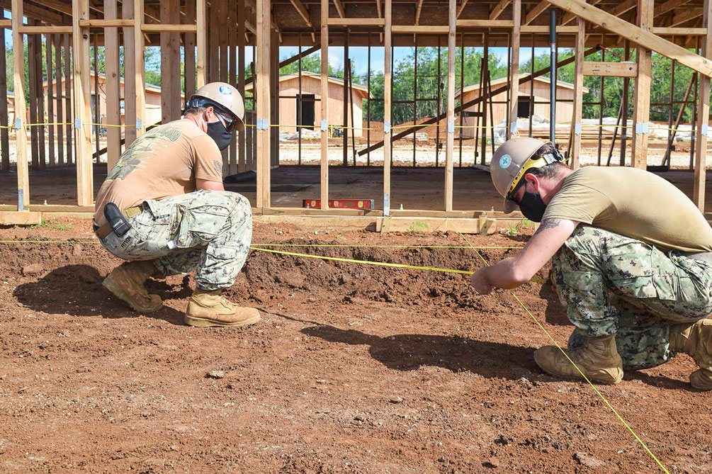 Engineering Aide 2nd Class Giacomo Fitton, from Gibsonville, N.C., and Construction Mechanic 2nd Class George Berry, assigned to U.S. Naval Mobile Construction Battalion 3’s Detail Tinian, measure the distances between the placements of string line used to show perimeters of a future concrete pad near the galley on Camp Tinian.