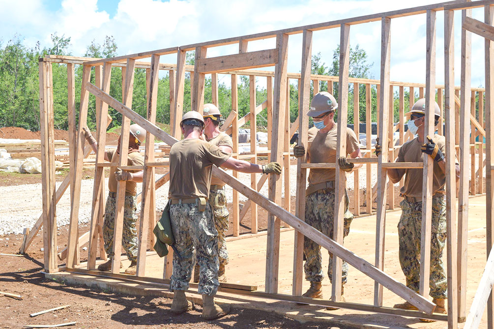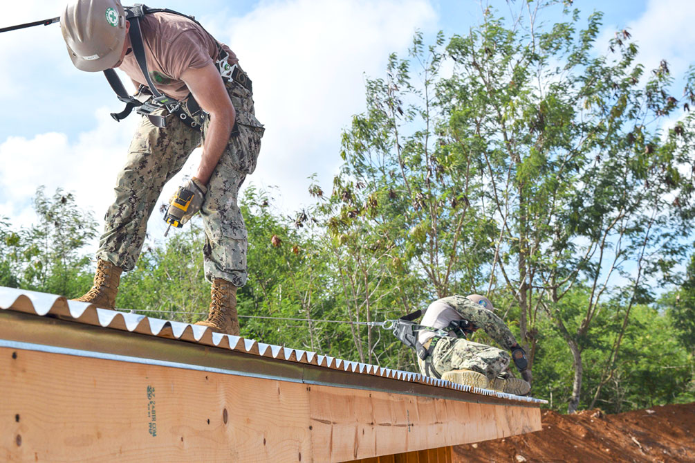 Builder Constructionman Matthew Best, from Stockton, Calif., and Engineering Aide 2nd Class Giacomo Fitton, from Gibsonville, N.C., both assigned to Naval Mobile Construction Battalion 3’s Detail Tinian, install corrugated metal sheeting on a Southwest Asia hut being constructed on Camp Tinian.