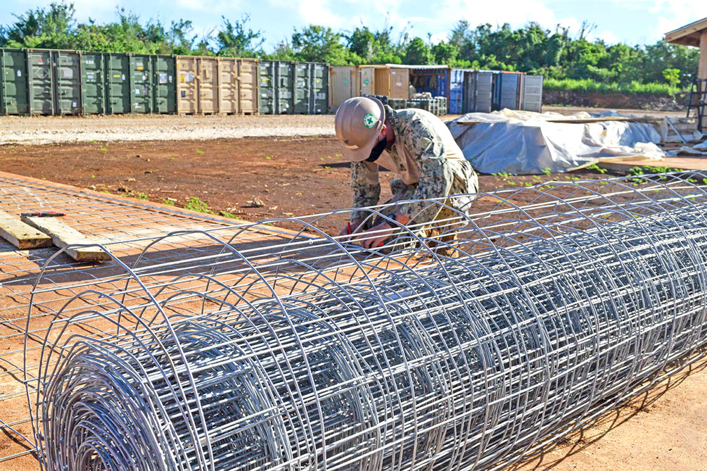 Steel Worker 3rd Class Bryce Thompson, from New Castle, Ind., assigned to U.S. Naval Mobile Construction Battalion 3’s Detail Tinian, cuts and measures reinforcing steel in preparation for a concrete placement on Camp Tinian.