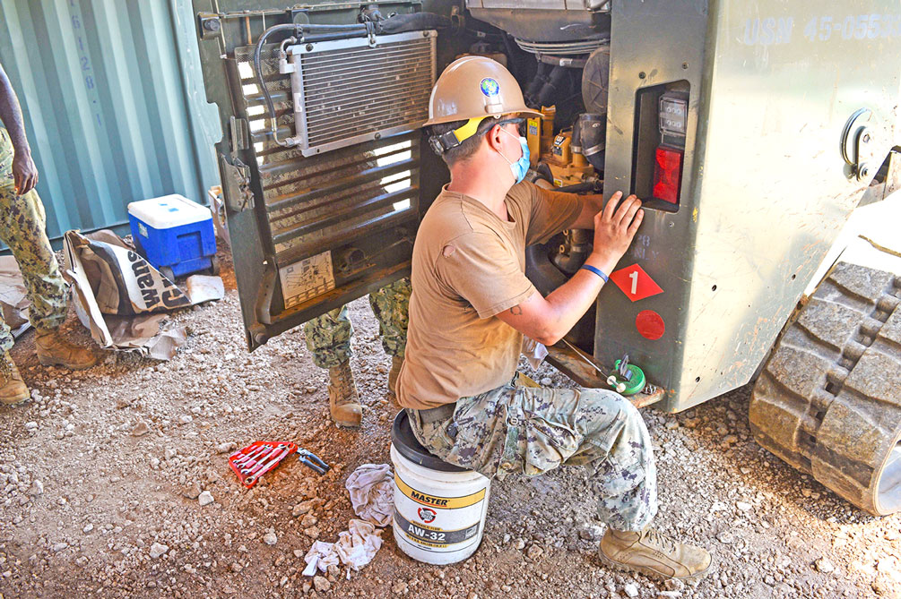 Construction Mechanic 2nd Class Brandon Block, from Belle Plaine, Min., assigned to Naval Mobile Construction Battalion 3’s Detail Tinian, performs maintenance on the fuel system of a skid-steer on Camp Tinian.