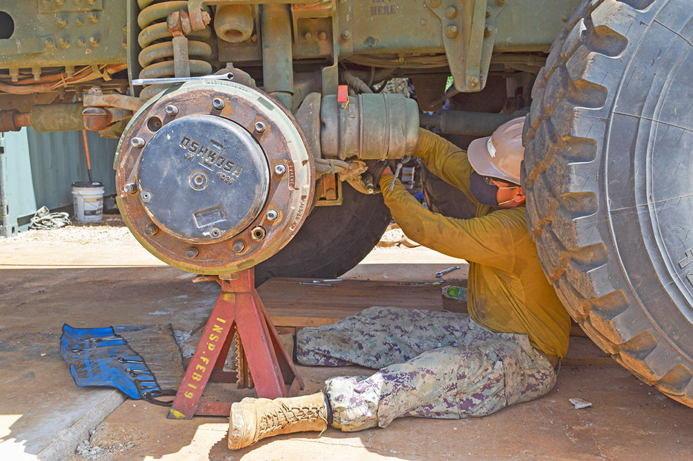 Construction Mechanic Constructionman Arturo Alvarez, from Bridgeton, N.J., assigned to Naval Mobile Construction Battalion 3’s Detail Tinian, performs maintenance on the air brake system on a Medium Tactical Vehicle Replacement on Camp Tinian.