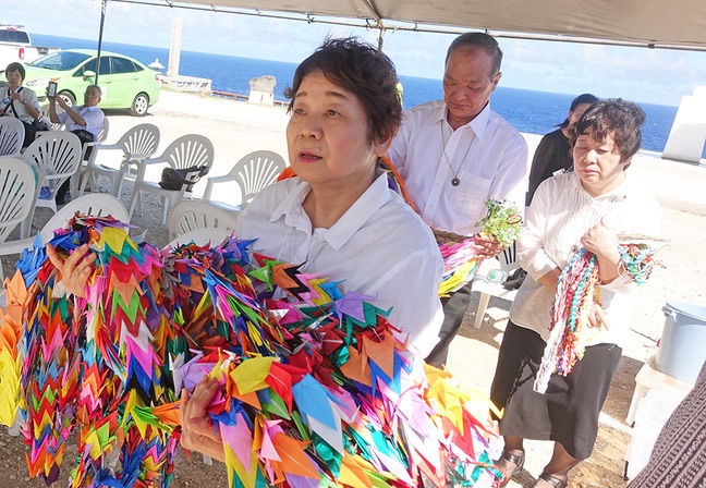 Members of the mission offered hymns and prayers, dedicated a thousand paper cranes—representing peace—and flowers, and walked the short distance from the Marpi memorial to Banzai Cliff for the dedication of flowers and prayers.
