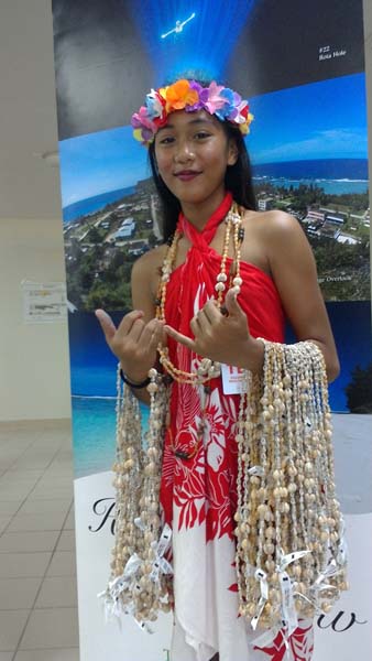 Vianny Mettao, a member of the Saipan Awaodori Team, carries shell leis that will be given to the passengers of Skymark Airlines’ inaugural direct daily flight Friday afternoon at the Francisco C. Ada/Saipan International Airport.