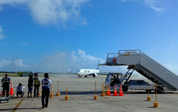 The inaugural Skymark Airlines regular, direct daily flights from Tokyo, Japan, to the Marianas received a water cannon salute at the Francisco C. Ada/Saipan International Airport on Nov. 29, 2019.