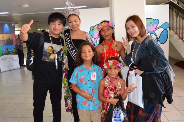 Passengers arriving aboard Skymark Airlines inaugural daily flights from Tokyo, Japan, to the Marianas on Nov. 29, 2019, are greeted by Miss Marianas 2019 Shannon Sasamoto, Marianas-chan (in blue), and island girls. (MVA)