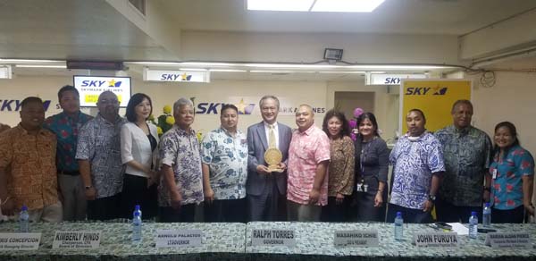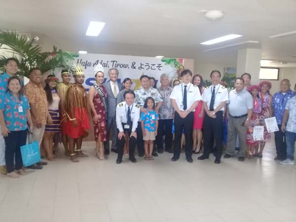 Gov. Ralph DLG Torres, Lt. Gov. Arnold I. Palacios, and Skymark Airlines president Masahiko Ichie pose for a group photo with Skymark’s pilots, Miss CNMI 2018 Celine Cabrera, Marianas Visitors Authority, and Commonwealth Ports Authority officials and staff at the Francisco C. Ada/Saipan International Airport last Friday afternoon. (Ferdie de la Torre)