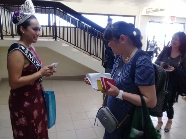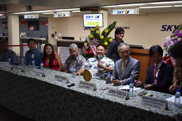 Gov. Ralph DLG Torres, fifth from left, Skymark Airlines’ president and representative director Masahiko Ichie, sixth from left, and other officials watch Marianas Visitors Authority board chair Marian Aldan-Pierce, rightmost, take her seat prior to the start of a press conference at the Francisco C. Ada/Saipan International Airport. Others in photo, from left, are Commonwealth Ports Authority executive director Chris Tenorio, MVA executive director Chris Concepcion, CPA board chair Kimberly King-Hinds, Lt. Gov. Arnold I. Palacios, and Skymark assistant general manager John Furuya. (Kevin Calibo)