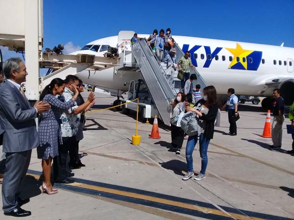 Gov. Ralph DLG Torres, first lady Diann Torres, and Skymark Airlines president and representative director Masahiko Ichie greet the passengers of Skymark’s inaugural flight from Japan at the tarmac. (Ferdie de la Torre)