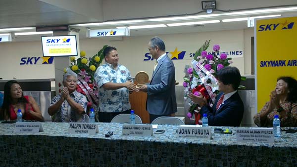 Gov. Ralph DLG Torres hands the CNMI’s commemorative gift to Skymark Airlines president and representative director Masahiko Ichie during a press conference. (Ferdie de la Torre)