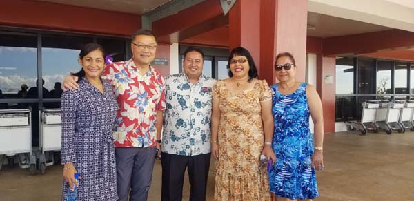 From left, first lady Diann Torres, Marianas Visitors Authority director Jerry Tan, Gov. Ralph DLG Torres, Rep. Janet U. Maratita (R-Saipan), and Wela Palacios, wife of Lt. Gov. Arnold I. Palacios, in last Friday’s inaugural flight of Skymark Airlines. (Jon Perez)