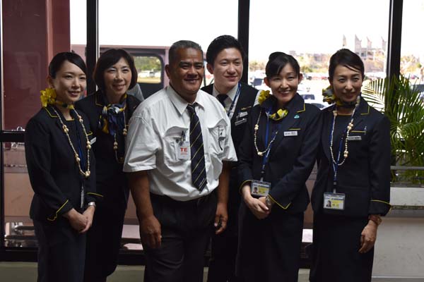 Airline staff of Skymark Airlines have their picture taken with an escort at the Francisco C. Ada/Saipan International Airport last Friday. (Jon Perez)