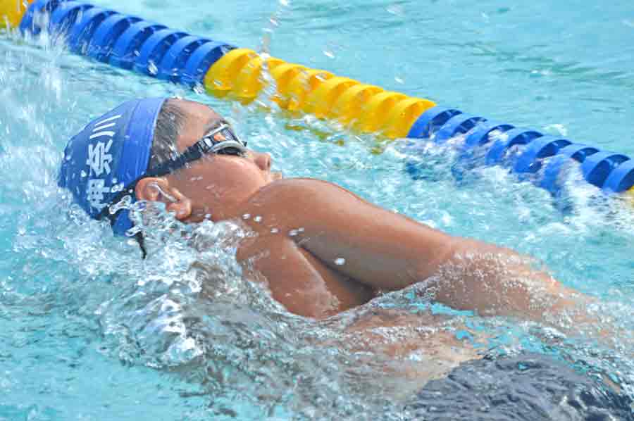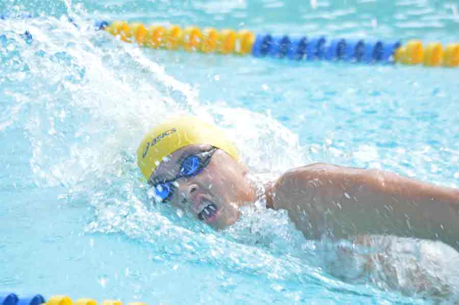 Swimmers splash water to their body before competing in the 400m freestyle race during the SSC Double Distance Meet held at the Kan Pacific Swimming Pool last Jan. 21.