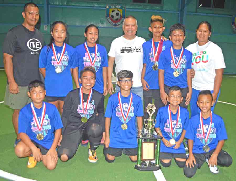 The Golden Glove winners, from left, Daniel Matsunaga, Mark Chavez, and Carla Ballesteros pose for a photo after receiving their medals at the awards ceremony for Saipan Soccer School’s 2018 Youth Futsal Tournament last Friday night at the TSL Sports Complex.