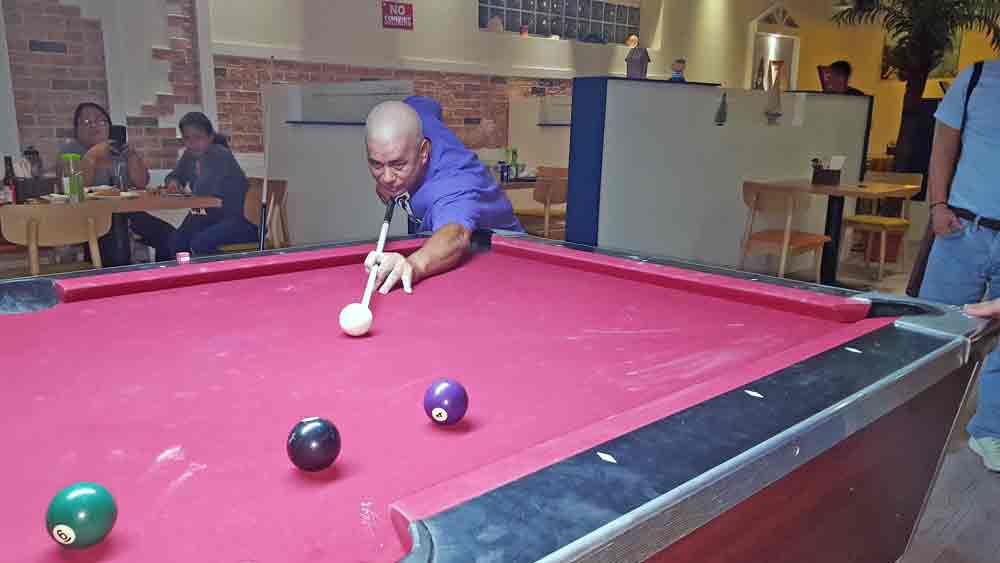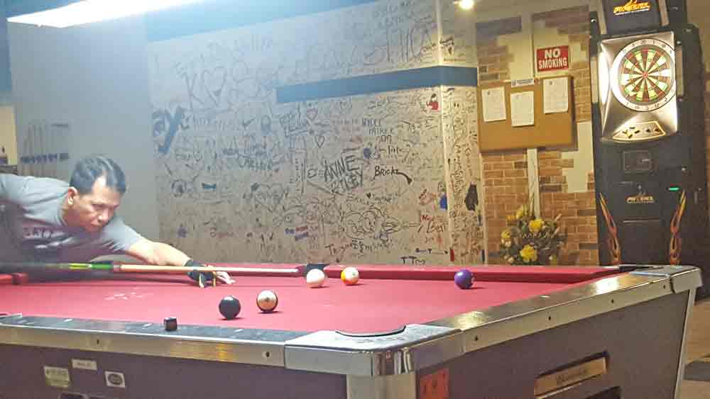 Joe Villagomez of Titans II tries to hit the 8-ball in their game against the Extreme in the Saipan Billiards Association Thursday League. (Contributed Photo)