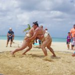 Best rank maegashira Kyokutaisei Takuya and Kyokushiuho Koki perform a fight exhibition for excited spectators at the sumo wrestling exhibition last Saturday at the beach side of Hyatt Regency Saipan.