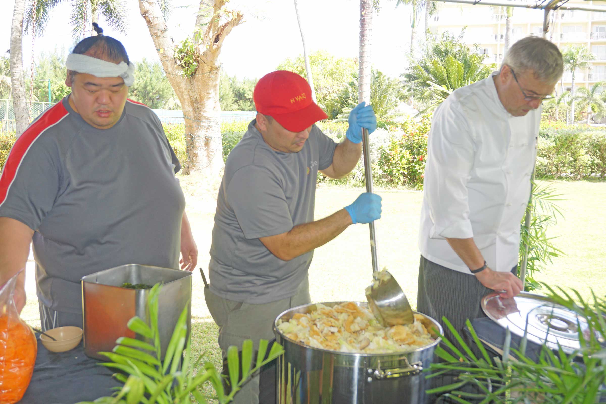 Families and guests were treated to a delicious meal of sumo stew and onigiri at the sumo wrestling exhibition held Saturday at the beach side of Hyatt Regency Saipan.