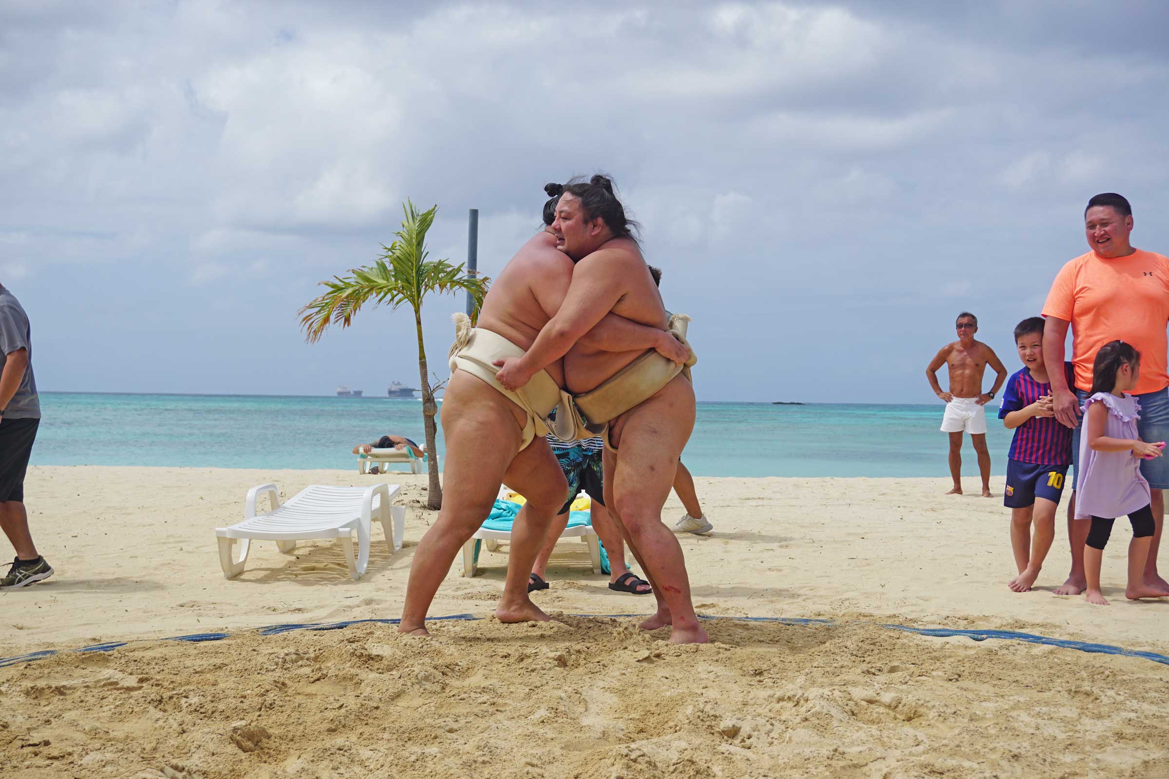 Best rank maegashira Kyokutaisei Takuya and Kyokushiuho Koki perform an exhibition bout for excited spectators at the sumo wrestling exhibition last Saturday at the beach side of Hyatt Regency Saipan, which has been transformed into a makeshift dohyu, the ring in which sumo wrestling bouts are held.