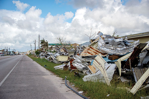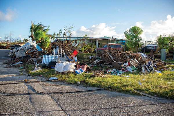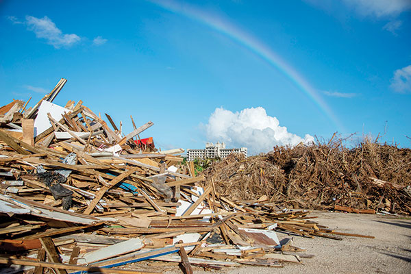 Piles of debris lay stacked in a parking lot after Super Typhoon Yutu made landfall on Saipan, damaging hundreds of homes and leaving many residents without power, shelter, food, or access to clean water. (GRACE SIMONEAU/FEMA)