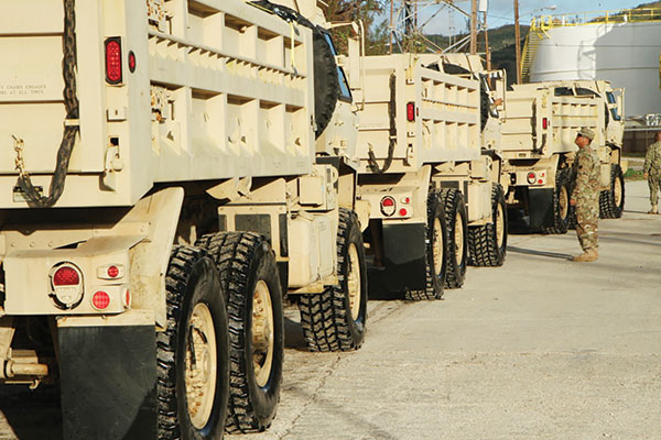 Ninth Mission Support Command soldiers, currently assigned to Joint Task Group-Saipan, Task Force-West, stage tactical vehicles for movement after coming off a Navy Landing Craft Utility at a port on Saipan. (STAFF SGT. JAMES KENNEDY BENJAMIN)