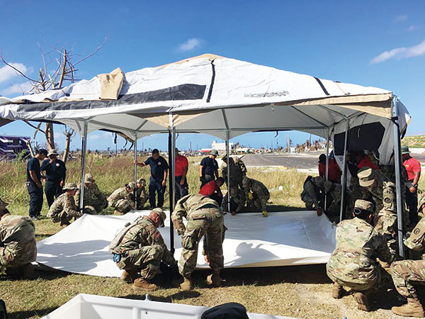 Army Reserve soldiers with the 797th Engineer Company (Vertical), 9th Mission Support Command, learn how to set up a Federal Emergency Management Agency tent at the Koblerville Fire Station on Saipan on Nov. 7. The tents will be used as temporary shelters for Saipan residents affected by Super Typhoon Yutu, a Category 5 storm, which devastated the island about two weeks ago. (SGT. 1ST CLASS HUGH SORIANO)
