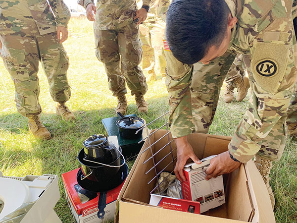 A soldier with the 797th Engineer Company (Vertical), 9th Mission Support Command, goes through an accessories box for Federal Emergency Management Agency tents at the Koblerville Fire Station on Saipan on Nov. 7. The soldiers spent a day learning all the tent components and how to set it up. (U.S. ARMY STAFF SGT. COLIN MCMAHON)
