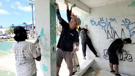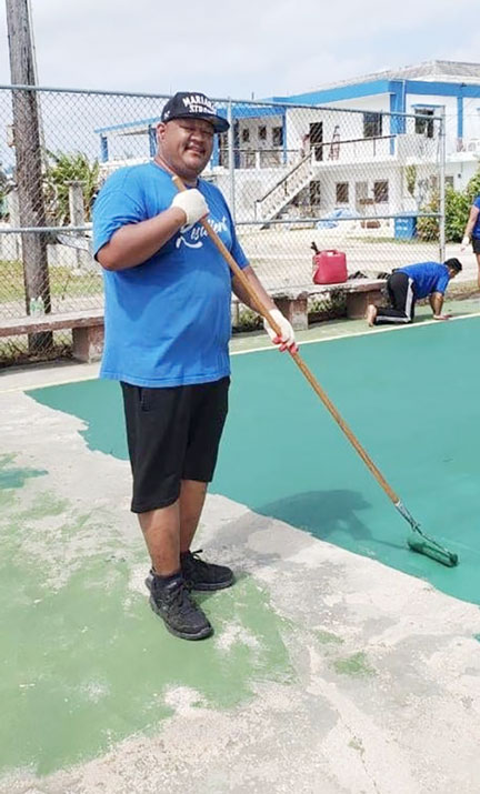 photo clockwise and John Paul Sablan, third photo, lead the improvement project at the basketball court and youth/center social hall in Susupe. (Contributed Photo)