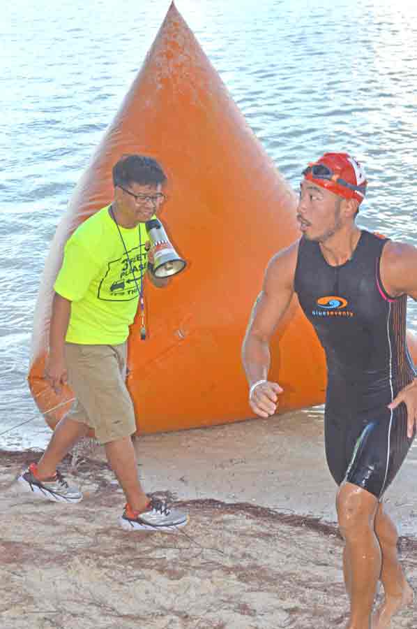 Lennosuke Suzuki runs out of the water during the 1.5-kilometer swim leg of last Saturday’s Tagaman Triathlon.