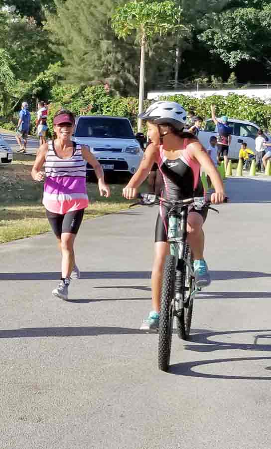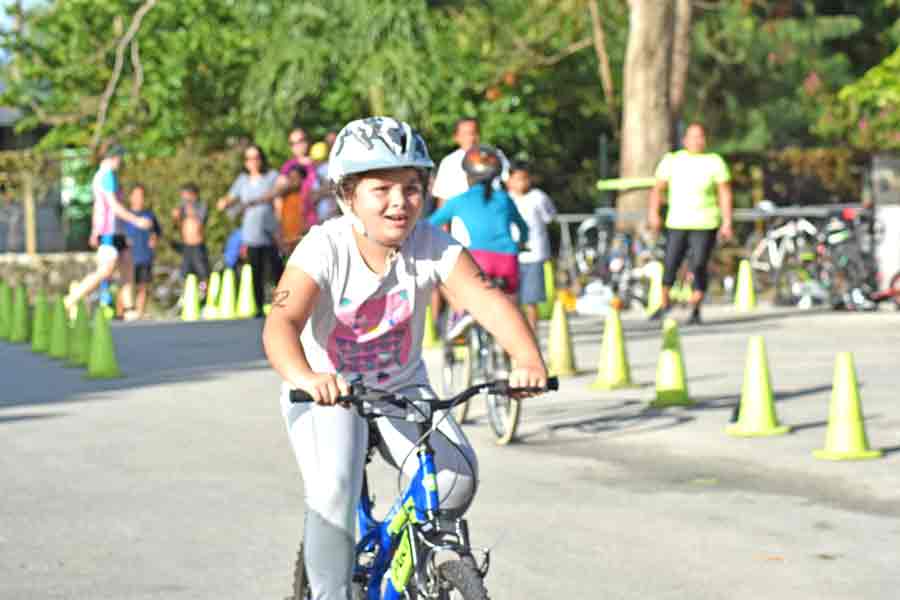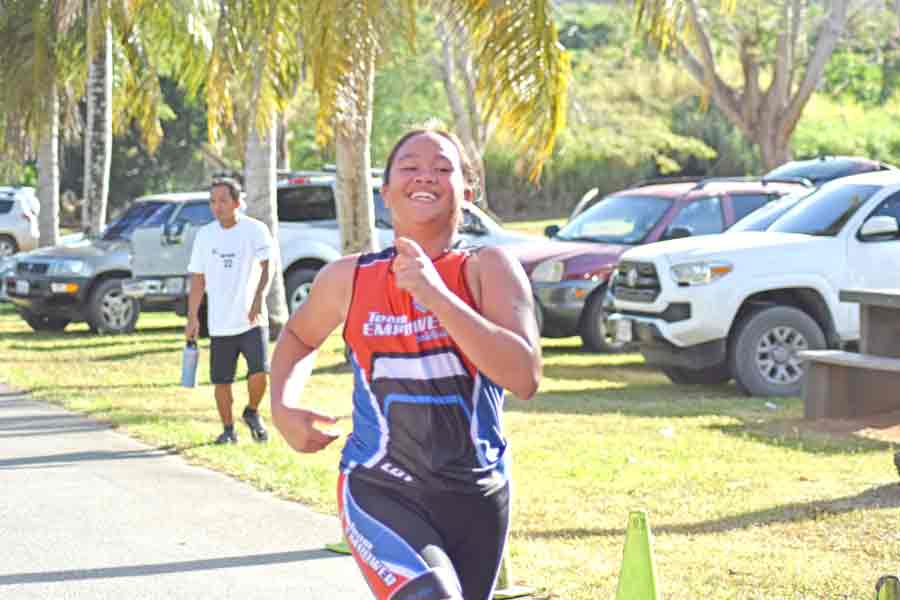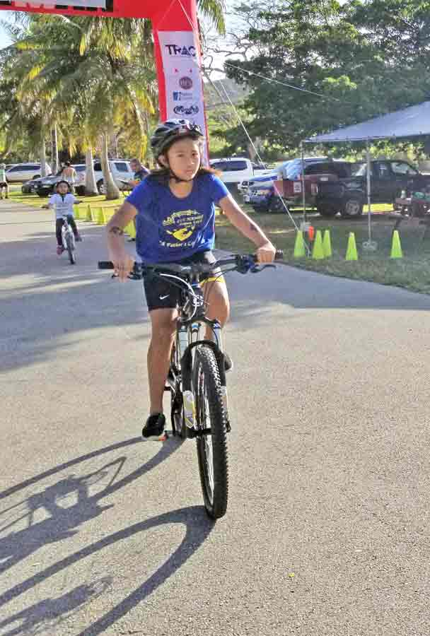 A participant in last Saturday’s Taga Kids Age Group & Relay Triathlon maneuvers her bike around the course at Paupau Beach.