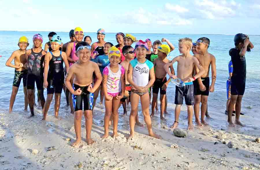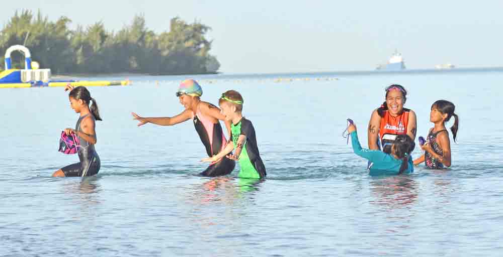 Some participants in the Taga Kids frolic in the waters off Paupau Beach while waiting for the start of the race.