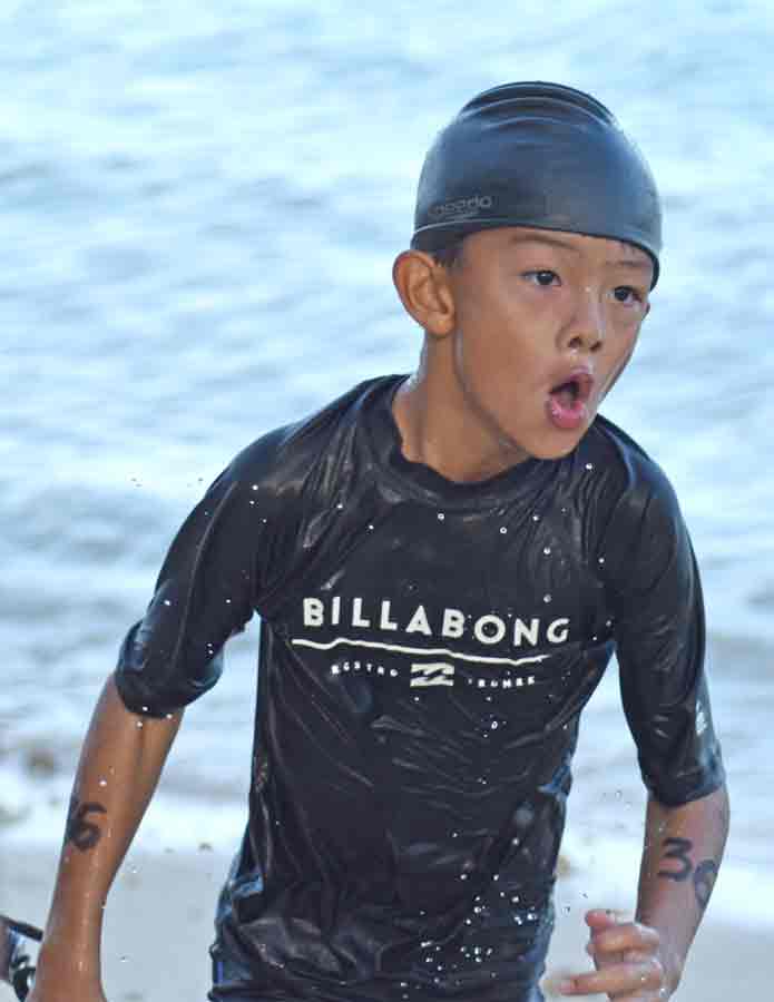 A U12 age group participant runs out of the water after completing the 50-meter swim.