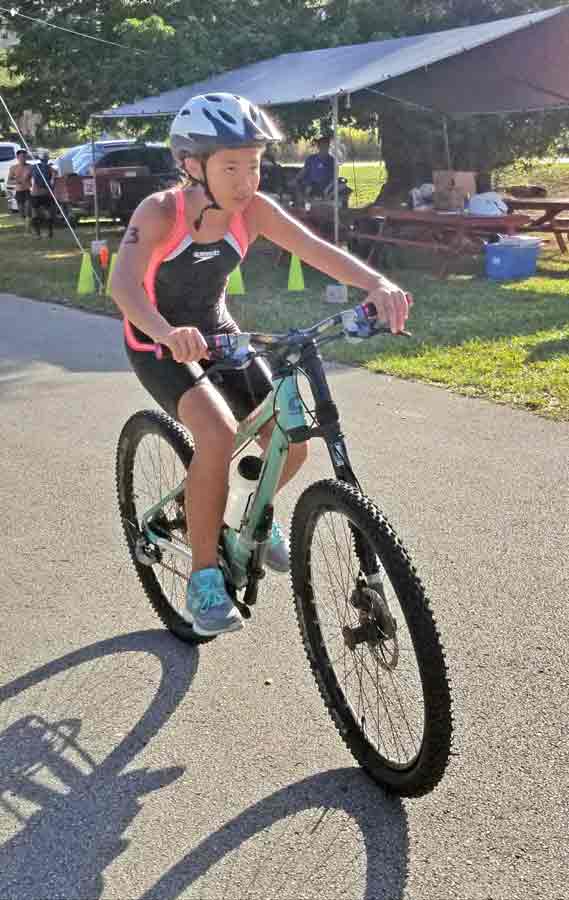 A competitor in the girls division heads out to the bike course.