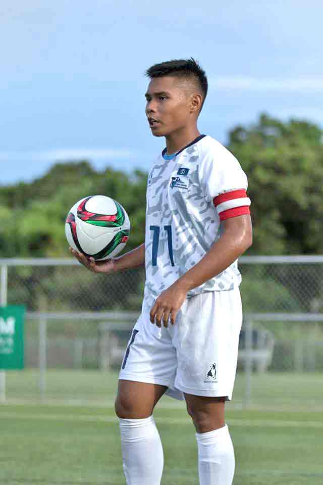 The CNMI Boys U18 National Team captain Ryan Relucio prepares to throw-in during their game against the Guam All-Stars in the Marianas Cup 2017 held last Oct. 8 at the Guam Football Association National Training Center in Dededo. (Guam Football Association Photo)
