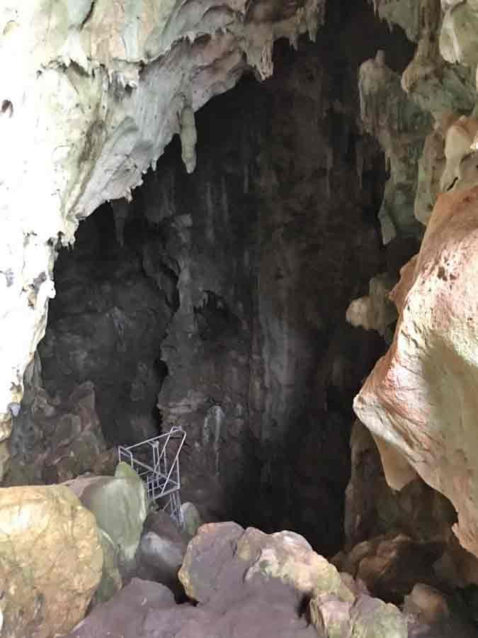 A: The inclination of the cave floor at the entrance is fairly steep and there is close to a 60-foot drop down to the cave’s middle chamber. There is an additional 100-foot drop within the middle chamber’s northern sector. Visitors to the cave are not allowed past the walkway because of these drops in elevation and the danger they present. The plaques near the Latte House serve to provide visitors information about the cave’s rock art.