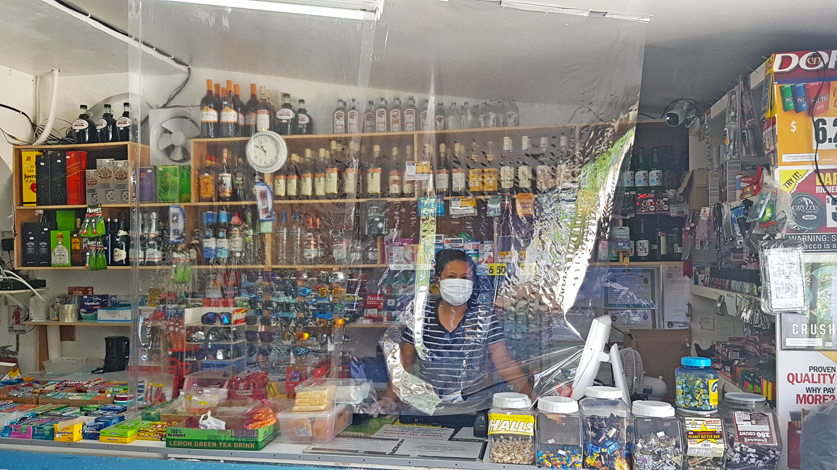 Behind her cash register, Imelda Estolas of KS Market in Garapan is protected by a plastic cover, the kind that you use to protect books that is attached from the ceiling down to the bubble gum and candy boxes at the counter. On this side of the grocery, she finds comfort and confidence to do her job.