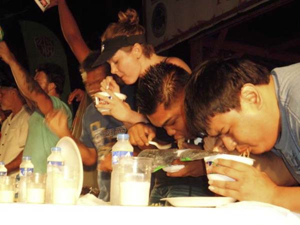 In the JC Café Burger Eating Contest, Byron Dela Cruz was the first to finish a one-pound hamburger pasted with ground donni and a side of fries sprinkled with donni powder.