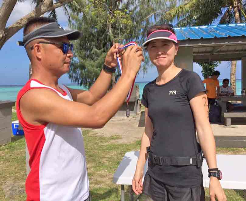 Women’s off-road runner-up Tomomi Sato, right, receives her medal from race volunteer Ronald Villafria.