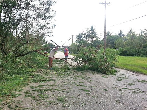 A felled tree blocks the road near the Oleai San Jose area as Saipan Mayor’s Office employees clear the road. (Erwin Encinares)