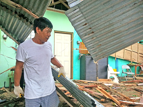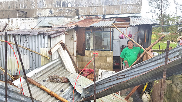 Chris Macana fixes the tin roof of an outdoor garage that collapsed in Koblerville. (Ferdie De La Torre)
