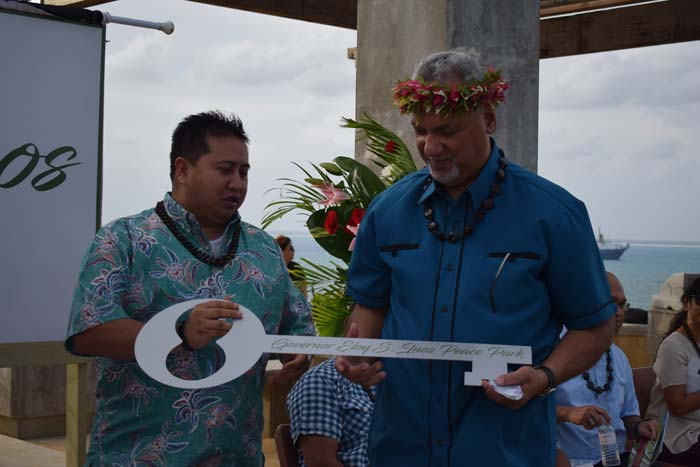 Gov. Ralph DLG Torres, second right, and Office of Management and Budget special assistant Vicky Villagomez, second left, turns over the ceremonial key to Department of Lands and Natural Resources Secretary Richard B. Seman, left, and Division of Parks and Recreation director Eli Cabrera. (Jon Perez)